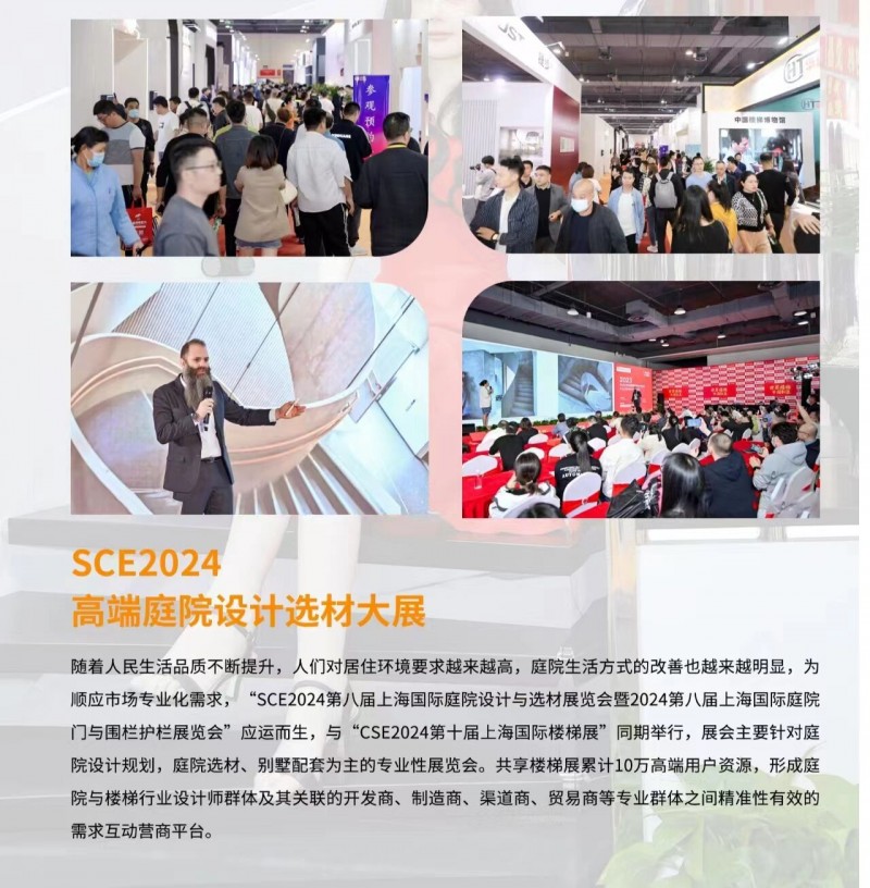 隨著人民生活品質不斷提升,人們對居住環境要求越來越高,庭院生活方式的改善也越來越明顯,為順應市場專業化需求,“SCE2024第八屆上海國際庭院設計與選材展覽會暨2024第八屆上海國際庭院門與圍欄護欄展覽會”應運而生,與“CSE2024第十屆上海國際樓梯展”同期舉行,展會主要針對庭院設計規劃,庭院選材、別墅配套為主的專業性展覽會。