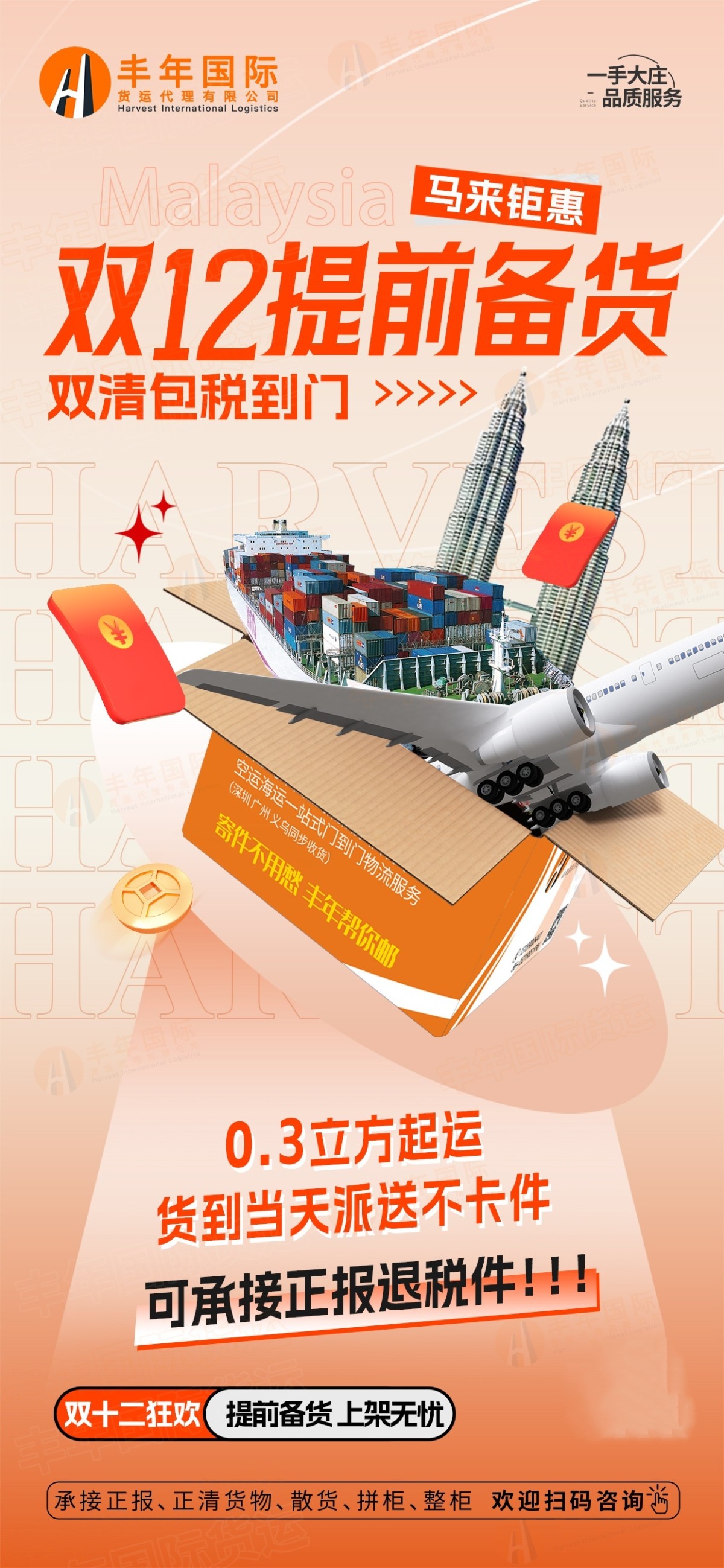豐年馬來西亞公司,馬來專線,起運量低,只需0.3立方,空運5-7天,海運14-18天,清關客服團隊30人,精通馬來西亞語和中文4000㎡巴生港轉運倉庫,16輛派送車。