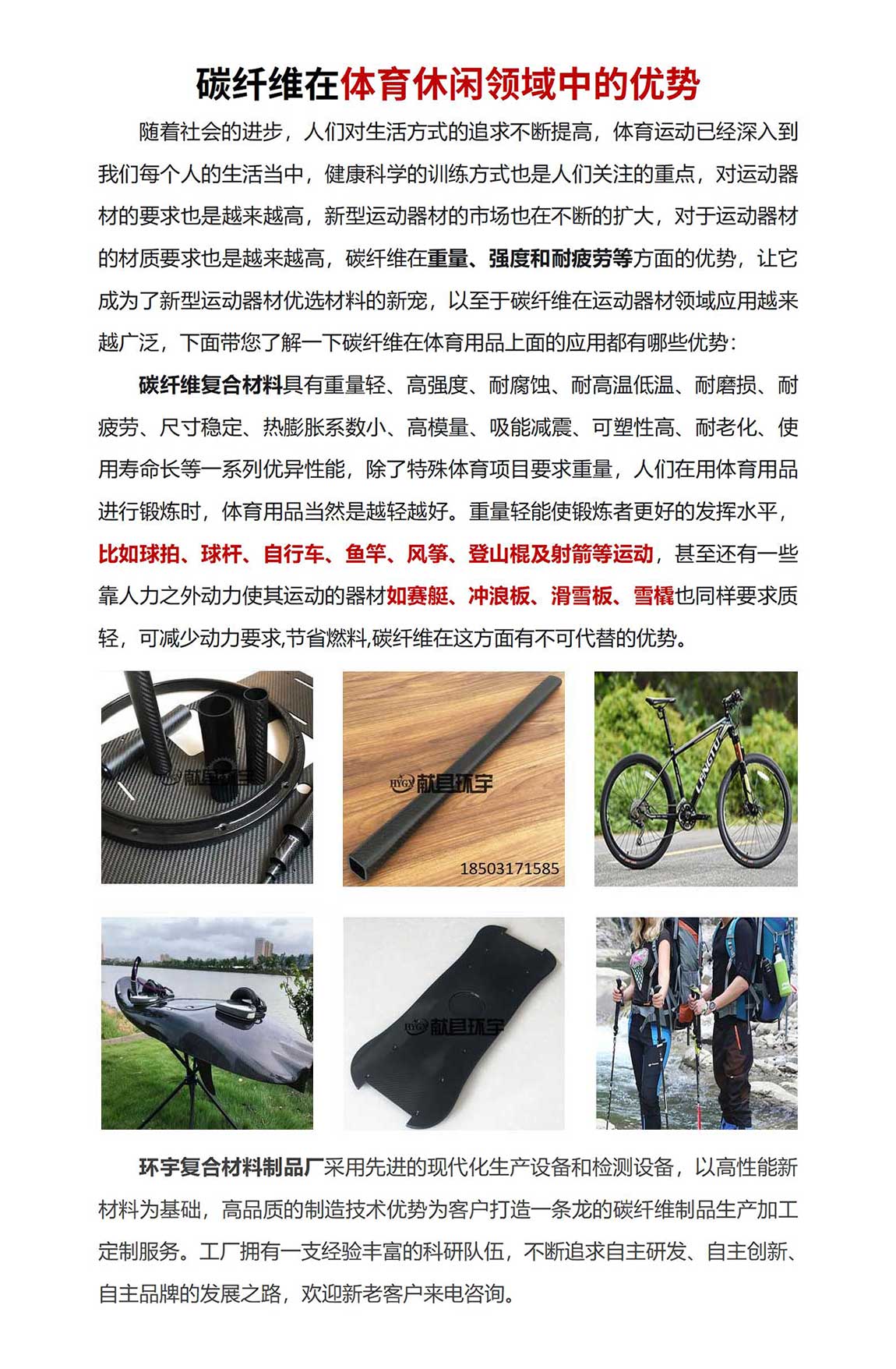 碳纖維復合材料具有重量輕、高強度、耐腐蝕、耐高溫低溫、耐磨損、耐疲勞、尺寸穩定、熱膨脹系數小、高模量、吸能減震、可塑性高、耐老化、使用壽命長等一系列優異性能,除了特殊體育項目要求重量,人們在用體育用品進行鍛煉時,體育用品當然是越輕越好。