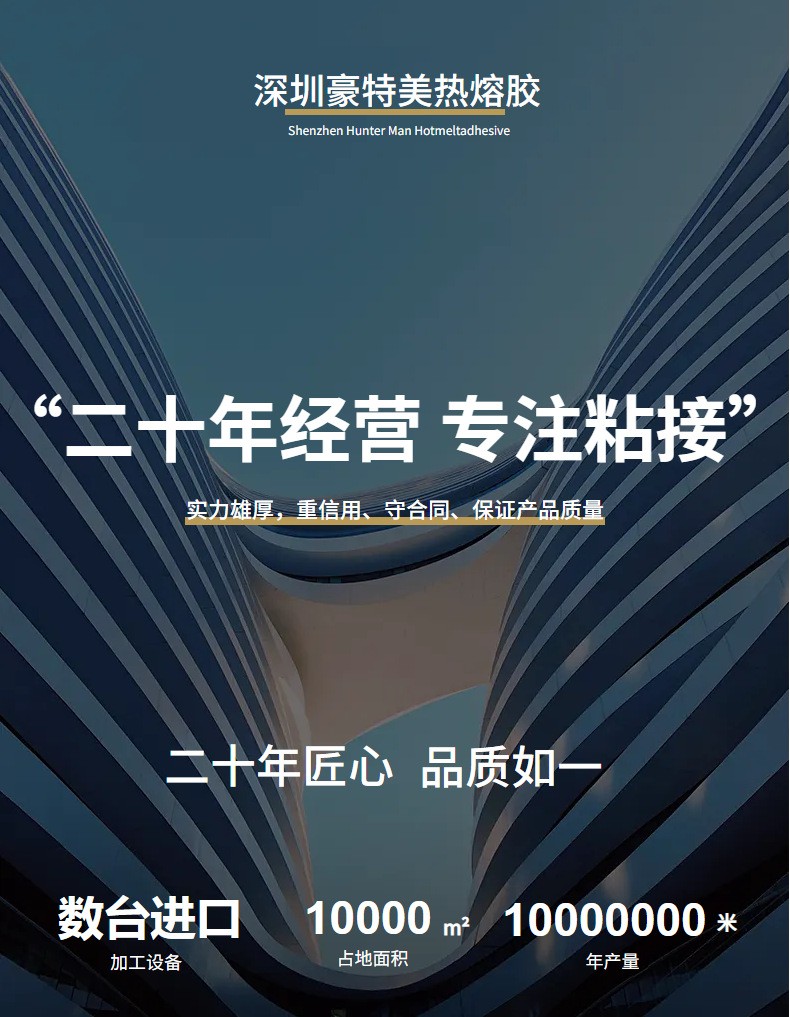 公司簡介 深圳市豪特美塑膠制品有限公司是一家擁有8年環保熱熔膠研制經驗的高分子技術團隊,是集研發及生產、銷售為一體的專業熱熔膠生產廠家。主營產品:PO熱熔膠膜、PES熱熔膠膜、PA熱熔膠膜、TPU熱熔膠膜、EVA熱熔膠膜、等各種合成熱熔膠膜以及熱熔膠帶、熱熔膠粒等各類熱熔膠粘接產品的生產以及研發。