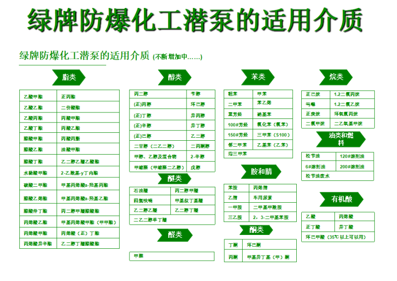綠牌防爆化工潛泵目前可以用于運輸180多種易燃易爆的介質,其中包括醇類、苯類、酮類、醚類、烷類、醛類、酯類、有機酸、柴油、汽油、航空煤油等。