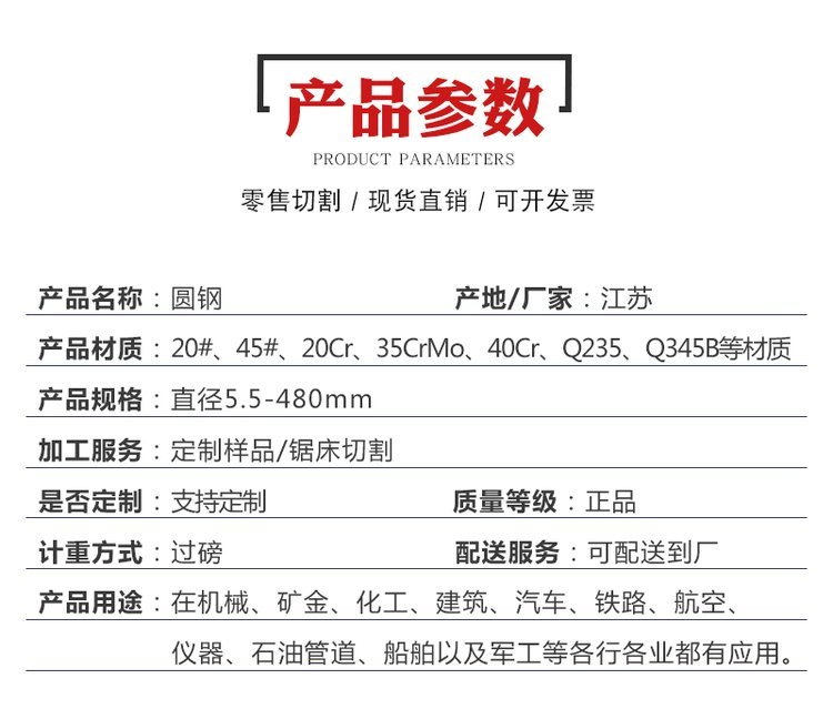 更新信息 快采購網(wǎng)供應(yīng)商無錫東復(fù)泰特鋼有限公司供應(yīng)Q235B圓鋼 黑皮熱軋材料 扁鋼 六角棒 無錫Q235B圓鋼,為您提供詳細(xì)的產(chǎn)品報價、參數(shù)、圖片等商品信息,本產(chǎn)品于2025-11-05 09:06更新,主要更新內(nèi)容為:產(chǎn)品類別、產(chǎn)品參數(shù)、產(chǎn)品價格、產(chǎn)品圖片等信息。如需進一步了解Q235B圓鋼 黑皮熱軋材料 扁鋼 六角棒 無錫Q235B圓鋼詳細(xì)信息,請與廠家直接聯(lián)系,并說明是在快采購網(wǎng)看到這條商機的。