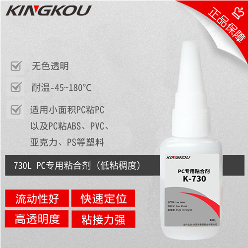K-730是東莞景固膠業針對PC塑料粘接而研發的一款溶劑型專用接著劑,主要針對粘接PC塑料以及PC與其它塑料材質的粘接。該膠水可溫室操作常溫固化,使用方便,對于常見ABS、PVC、PS等多種基材都能達到較高的粘接強度。本產品性能穩定,膠層透明無色、白化程度低,粘接面清潔美觀,耐濕熱老化,無揮發性有害成分,膠液固化后環保通過SGS認證。