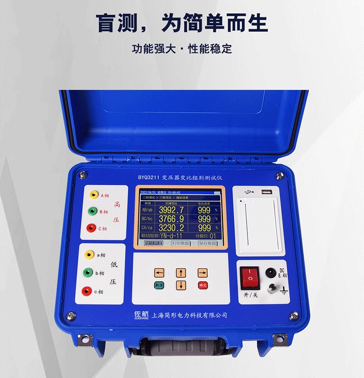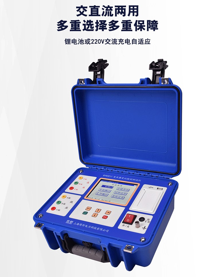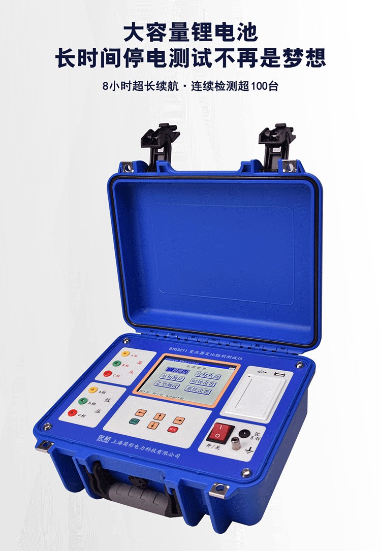 1. 鋰電池供電或者220V交流供電自適應,一次充電,可連續進行100臺以上變壓器變比組別測試,測試過程簡單、方便。