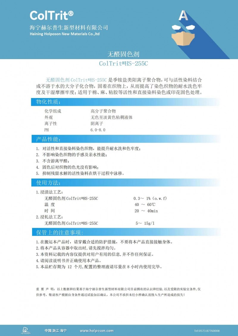 無(wú)醛固色劑ColTrit? HS-255C是季銨鹽類(lèi)陽(yáng)離子聚合物,可與活性染料結(jié)合成不溶于水的大分子化合物,固著在織物上,從而提高了染色織物的耐水洗色牢度及干濕摩擦牢度;適用于棉、麻、粘膠等活性和直接染料染色或印花固色處理。