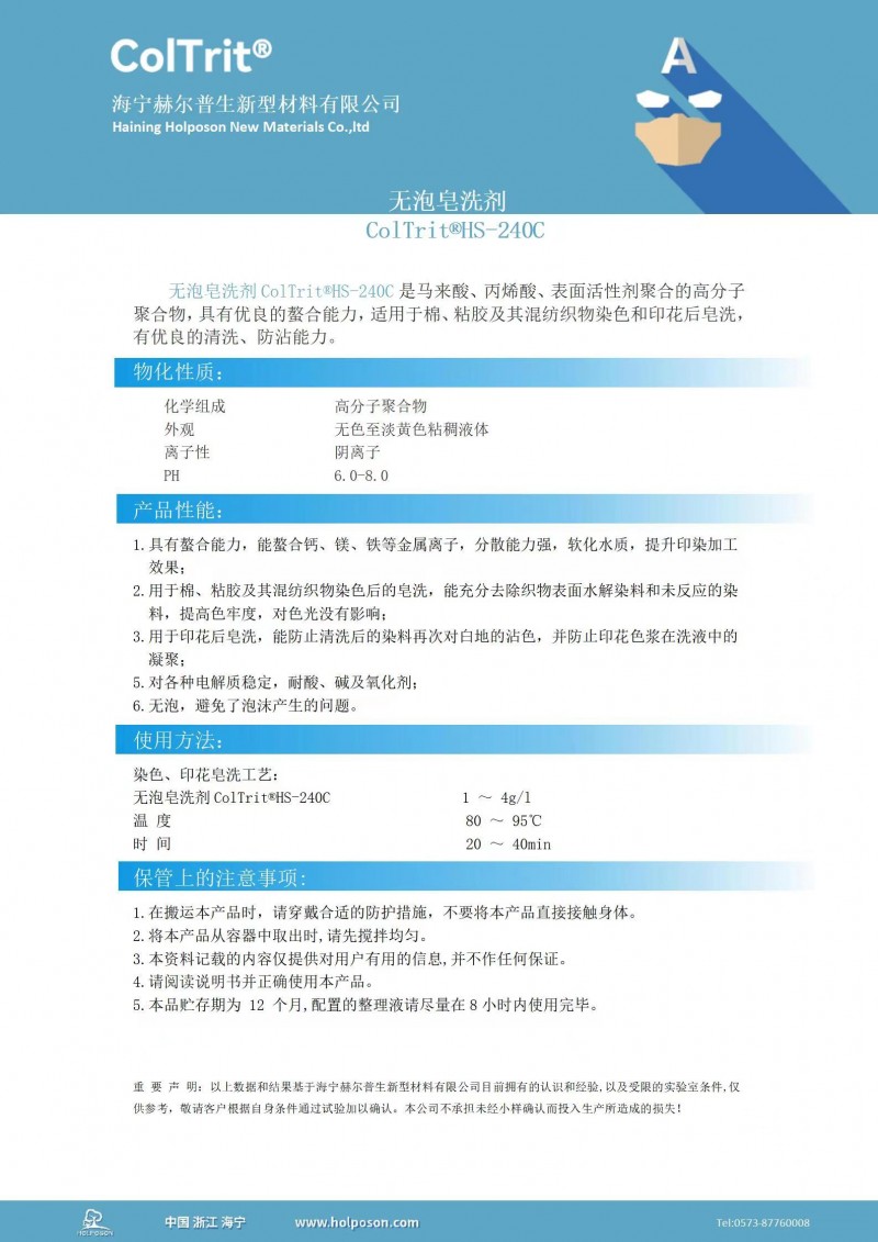 無泡皂洗劑ColTrit?HS-240C是馬來酸、丙烯酸、表面活性劑聚合的高分子聚合物,具有優異的螯合能力,適用于棉、粘膠及其混紡織物染色和印花后皂洗,有非常優異的清洗、防沾能力。