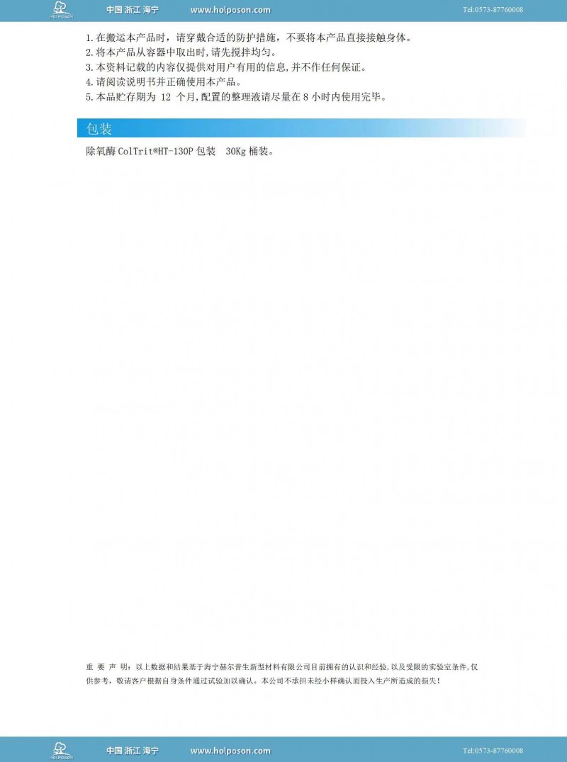除氧酶ColTrit?HT-130P是一種由基因改性的黑曲霉深層發(fā)酵而產(chǎn)生的高濃度的工業(yè)級(jí)液體過(guò)氧化氫酶制劑,可有效、快速去除漂白后殘留在織物、紗線和水浴中的雙氧水,縮短工藝時(shí)間,減少三廢排放。適用于棉及其混紡織物漂白工藝完成后殘留雙氧水的去除。