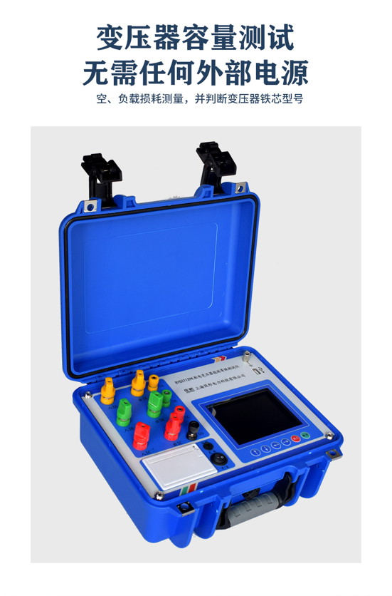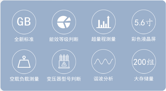 儀器可對10kV配電變壓器的能效等級進行準確的測量與判斷,并且對應能效等級,油浸式變壓器損耗可測量到S22(電工鋼帶)和SH25(非晶合金);干式變壓器損耗可測量到SCB18(電工鋼帶)和SCBH19(非晶合金)。