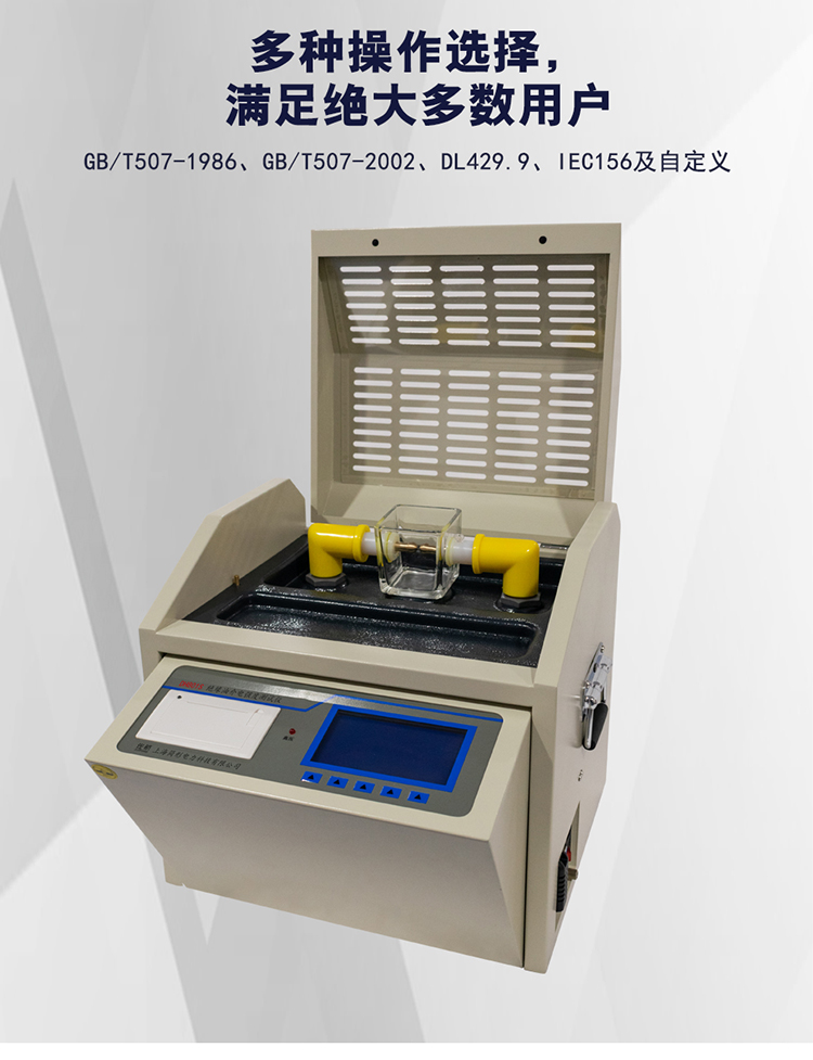 3. 多種操作選擇,儀器程序設有GB507-1986GB507-2002兩種標準方法、行業(yè)標準DL/429、國際標準IEC156及自定義操作,能適應不同用戶的多種選擇;