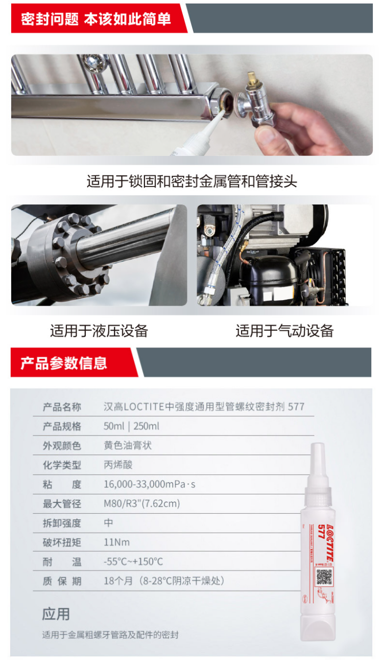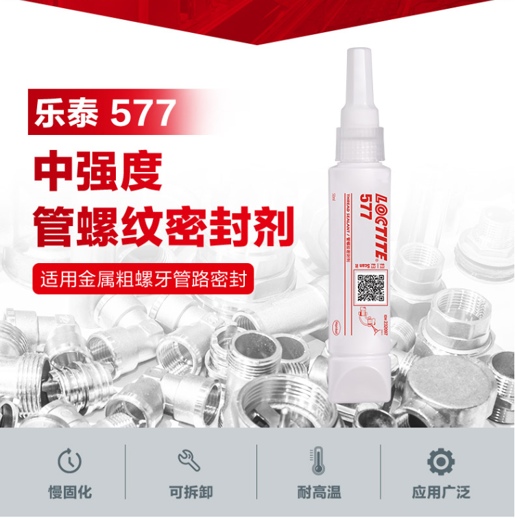 A:樂泰577; ?用于粗牙螺紋部件上的通用密封?適用于需要低溫的環(huán)境,例如室外器械維護(hù)。