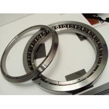 交叉圓錐滾子軸承是由兩列相互垂直的軸承道以及相互交叉排列成90°的一組圓錐滾子組成,滾子間有尼龍隔離塊隔開,防止了滾子的傾斜和滾子間的摩擦,減小了旋轉(zhuǎn)力矩,它可以承受徑向負荷,軸向負荷和傾覆力矩等聯(lián)合載荷。該軸承具有很高的旋轉(zhuǎn)精度,常用的精度是P5和P4級.交叉圓錐滾子軸承采用了大錐角和錐形幾何設(shè)計,使軸承總體有效跨距更大;其極限轉(zhuǎn)速遠高于交叉圓柱滾子軸承 ,摩擦力矩也低于交叉圓柱以子軸承。
