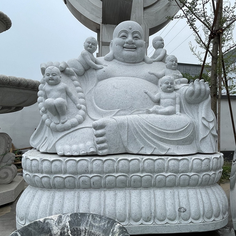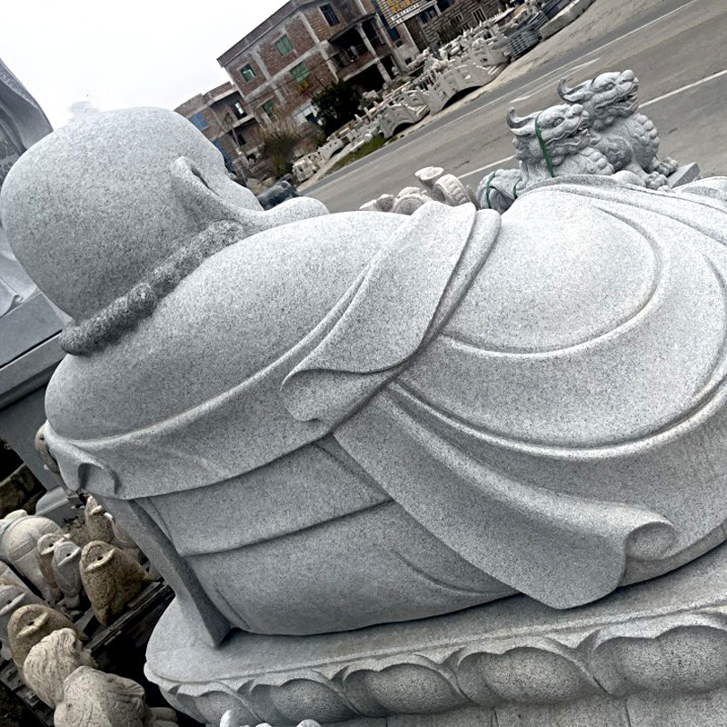 后來(lái),人們便將石雕彌勒佛與布袋和尚聯(lián)系起來(lái),參照布袋和尚的外貌形態(tài)塑造了現(xiàn)在我們所見(jiàn)到的石雕彌勒佛形象。慈顏善目、笑口常開(kāi)的石雕彌勒佛形象也將大乘佛教的寬宏大量、慈悲為懷的宗旨形象化了。石雕彌勒佛無(wú)拘無(wú)束和泰然處之的人生哲學(xué),也啟迪世人要擁有寬容的心靈。大部分寺廟都喜歡供奉石雕彌勒佛像,因?yàn)橄笳髦缺⑷倘琛捜莺蜆?lè)觀的石雕彌勒佛,不僅可以給世人帶來(lái)輕松愉快的心情,還可以讓人們從石雕彌勒佛的法相中,得到啟發(fā),讓自己也像彌勒佛一般,具有慈悲、忍辱、寬容與樂(lè)觀的品格,從而成為一個(gè)品格高尚,受人歡迎的人。