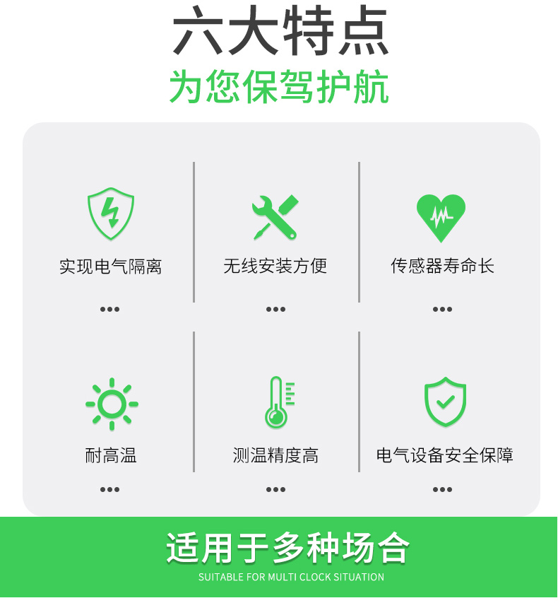 電氣接點(diǎn)在線測溫裝置適用于高低壓開關(guān)柜內(nèi)電纜接頭、斷路器觸頭、刀閘開關(guān)、高壓電纜中間頭、干式變壓器、低壓大電流等設(shè)備的溫度監(jiān)測,防止在運(yùn)行過程中因氧化、松動、灰塵等因素造成接點(diǎn)接觸