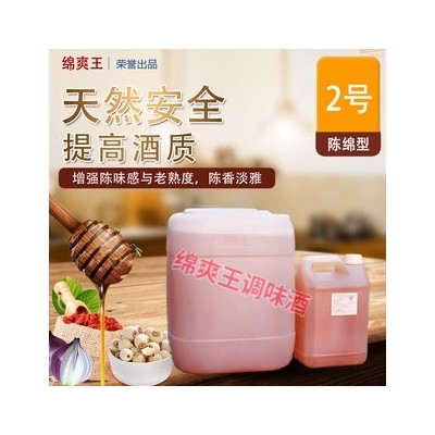 二號調味酒。綿爽王二號調味酒為陳綿型。在綿柔基礎上突出酒的陳味感,主要解決酒香飄浮的散混問題與降低新酒味。能使酒香陳而聚合,促進香與味結合不分,且有幽雅細膩感。一般用量在萬分之二至萬分之十不等。