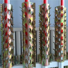 6.安裝:防盜刺安裝時離地面1.8m至2m位置開始,每根管道安裝三根,采用內六角鑼栓,鑼母自鎖鑼母裝配,簡便、靈活,具有防拆卸功能