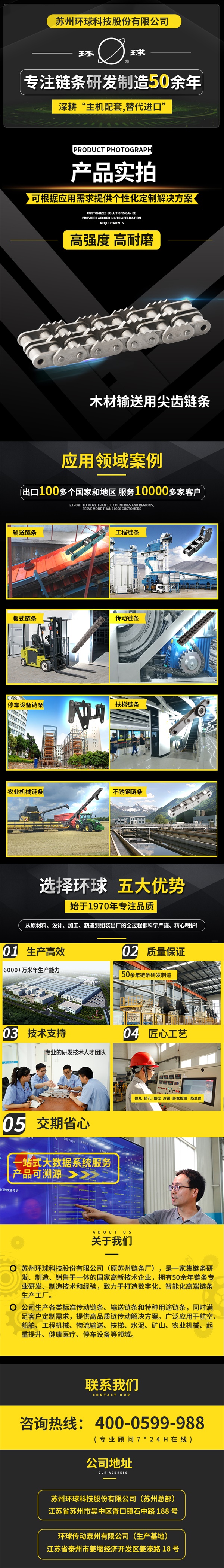 公司簡介 環球傳動(原蘇州農機配件廠)始建于1970年,是一家集鏈條、軸承和智能系統研發、制造、銷售于一體的高新技術企業,是中國鏈傳動行業重點骨干企業和專精特示范企業。擁有50年鏈條專業研發、制造技術和生產經驗,致力于打造數字化、智能化的高端鏈條生產基地。公司生產各類傳動鏈、輸送鏈、曳引鏈和特種用途鏈條,滿足客戶定制。廣泛應用于工程機械、物流輸送、自動扶梯、水泥、礦山、農業機械、起重提升、停車設備等領域。