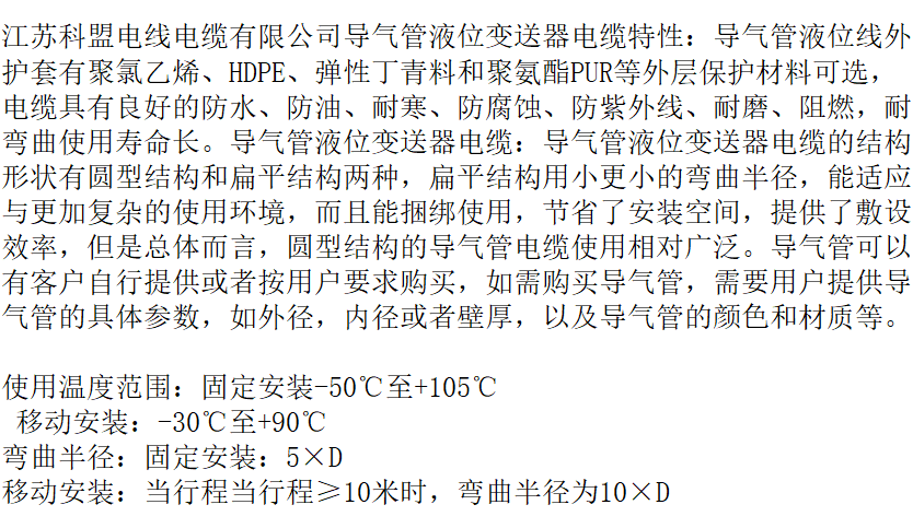 主要配套液位變送器測量用,帶導(dǎo)氣管和雙屏蔽,確保測量數(shù)據(jù)的準(zhǔn)確性。聚醚型聚氨酯外被適用于大部分腐蝕性溶劑溶液。