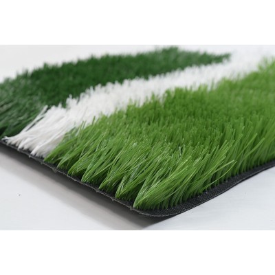 6、在需要鑲入白線的位置剪掉綠色人造草坪,鑲入接接帶,并在上面涂上膠水,然后把剪好的白色人造草球場線鑲入在鋪裝前標注好的球場線的位置與拼接帶進行粘結。