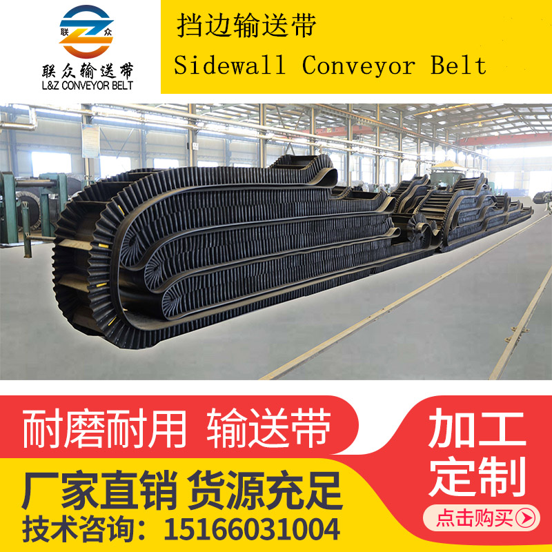 結構:擋邊輸送帶由基帶 裙邊 橫隔板三部分組成。基帶可分為分層織物輸送帶 鋼絲繩芯輸送帶或金屬網芯輸送帶等;擋邊分為SW型;隔板分為TTC型等