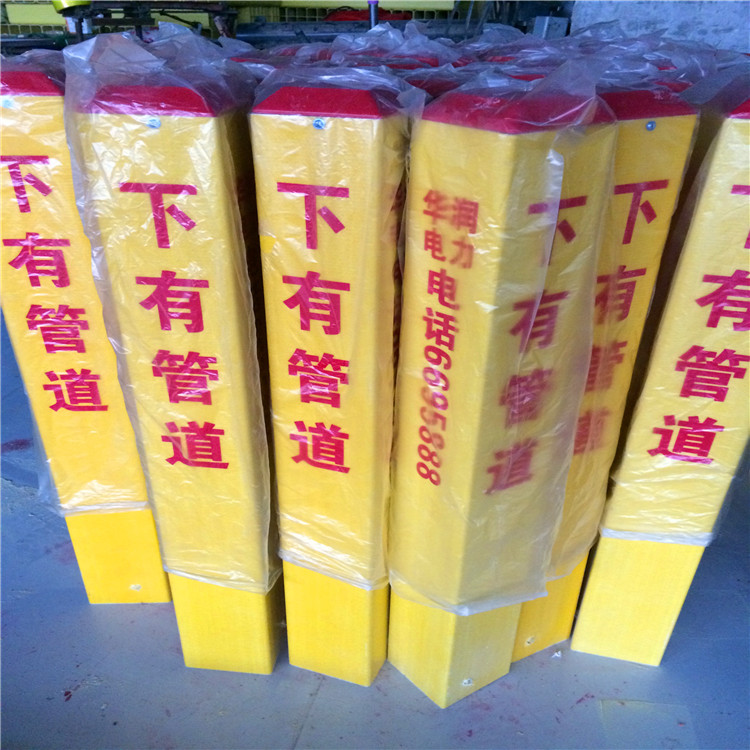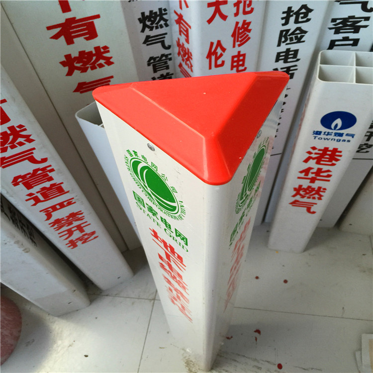 玻璃鋼標志樁:經高溫壓制而成。抗沖擊,耐磨損,耐高溫,耐腐蝕,可以抗水、汽油、酒精、電解鹽、醋酸、鹽酸、鈉鉀化合物、尿、瀝青,適合各種酸堿土壤。使用壽命長達30年。內容采用絲網印刷技術,警示效果好,不需要維護。重量輕,便于運輸安裝。無回收價值,自然防盜。