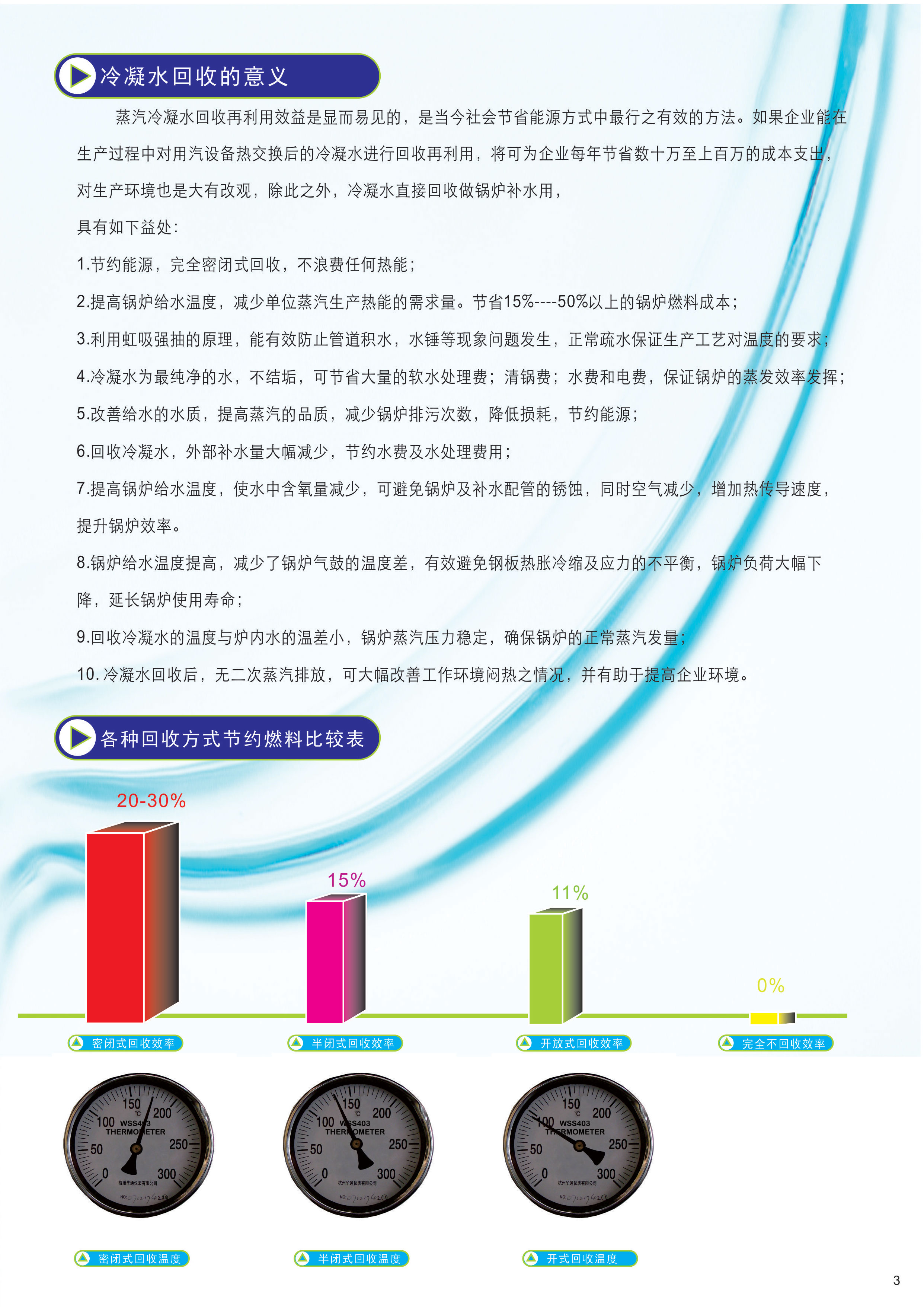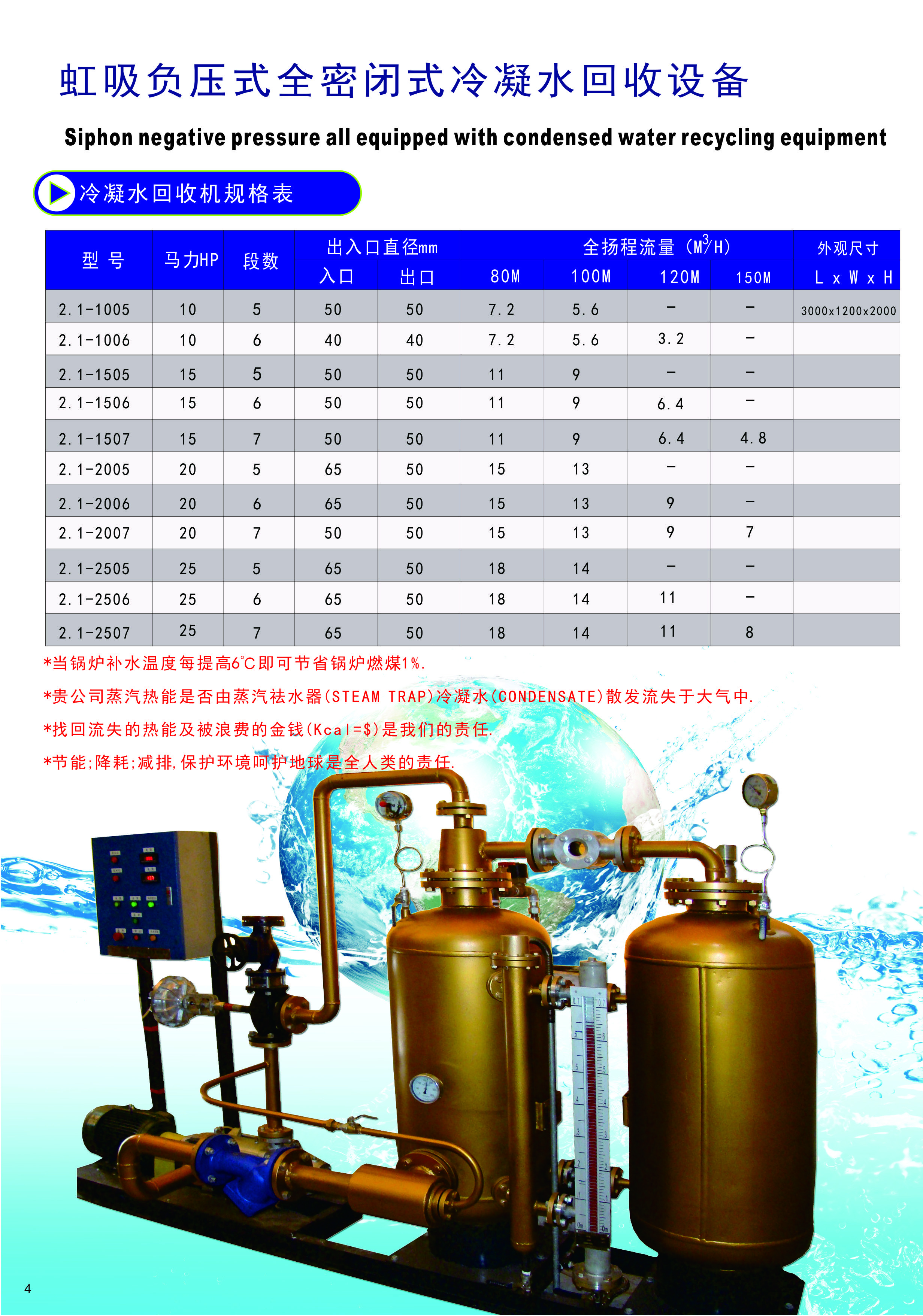 完全密閉式高溫冷凝水回收,可回收180℃以下的高溫冷凝水。系統(tǒng)采用PLC自動(dòng)控制,無(wú)人值守,運(yùn)行安全可靠,節(jié)能效率可達(dá)20%以上。適合回收啤酒、煙草、造紙、紡織、印染、化纖、木材、化工、橡膠、汽車、建材、賓館采暖等行業(yè)的蒸汽冷凝水。     為您節(jié)省15%---50%  以上的鍋爐燃料  1可做到真正的密閉式回收效益,不浪費(fèi)任何熱能,達(dá)到的節(jié)能效果。  2產(chǎn)品設(shè)計(jì)完善,性能穩(wěn)定,效率高。  3密閉式回收,能有效彌補(bǔ)疏水閥選型不當(dāng)而造成用汽設(shè)備蒸汽泄漏。  4利用虹吸強(qiáng)抽原理,能有效防止管道積水;水錘等現(xiàn)象問(wèn)題的發(fā)生,正常疏水保證生產(chǎn)工藝對(duì)溫度的要求,不會(huì)影響企業(yè)正常化生產(chǎn)。