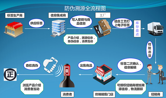 防偽溯源系統貫穿生產源頭到消費終端,對產品原料、生產、倉儲、流通、銷售和服務環節進行全鏈路數字化管理。實現來源可查,去向可追,責任可究。
