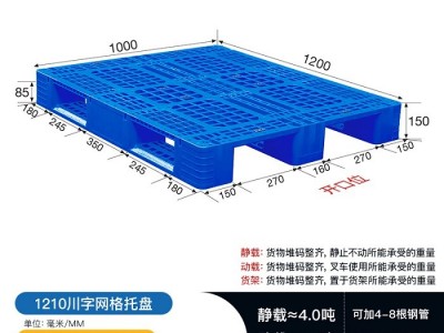 1210川字 (2).jpg1210網格川字塑料托盤是一種配合叉車及貨架使用的物流單元,以自重輕,承載強,防蟲蛀,防銹耐腐蝕,易清潔,衛生,可多向進叉,使用方便,使用周期長的特點受到了一些生產及運輸企業的青睞。川字型塑料托盤靜載一般為4T;動載在1-1.5T;加鋼管可上貨架不超1噸,也可用于出口貿易行業使用。微信圖片_20220306104102.png1210川字.png產品特點: