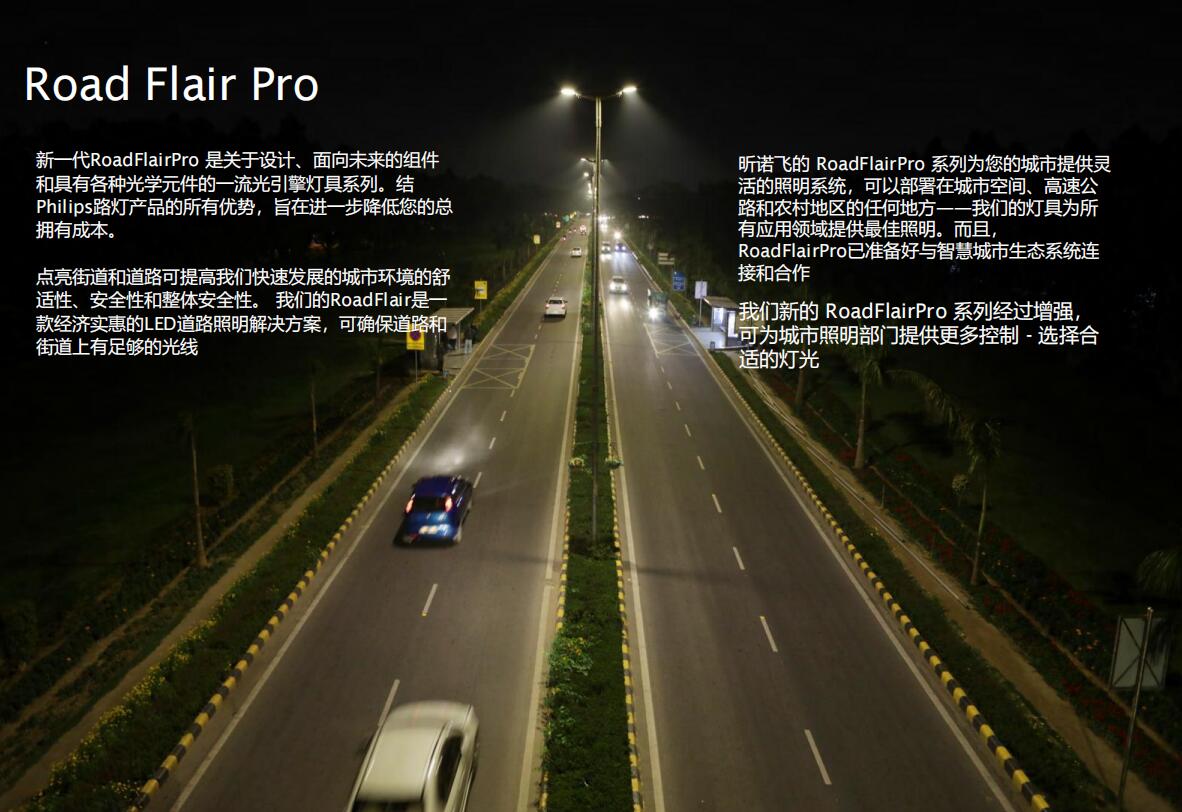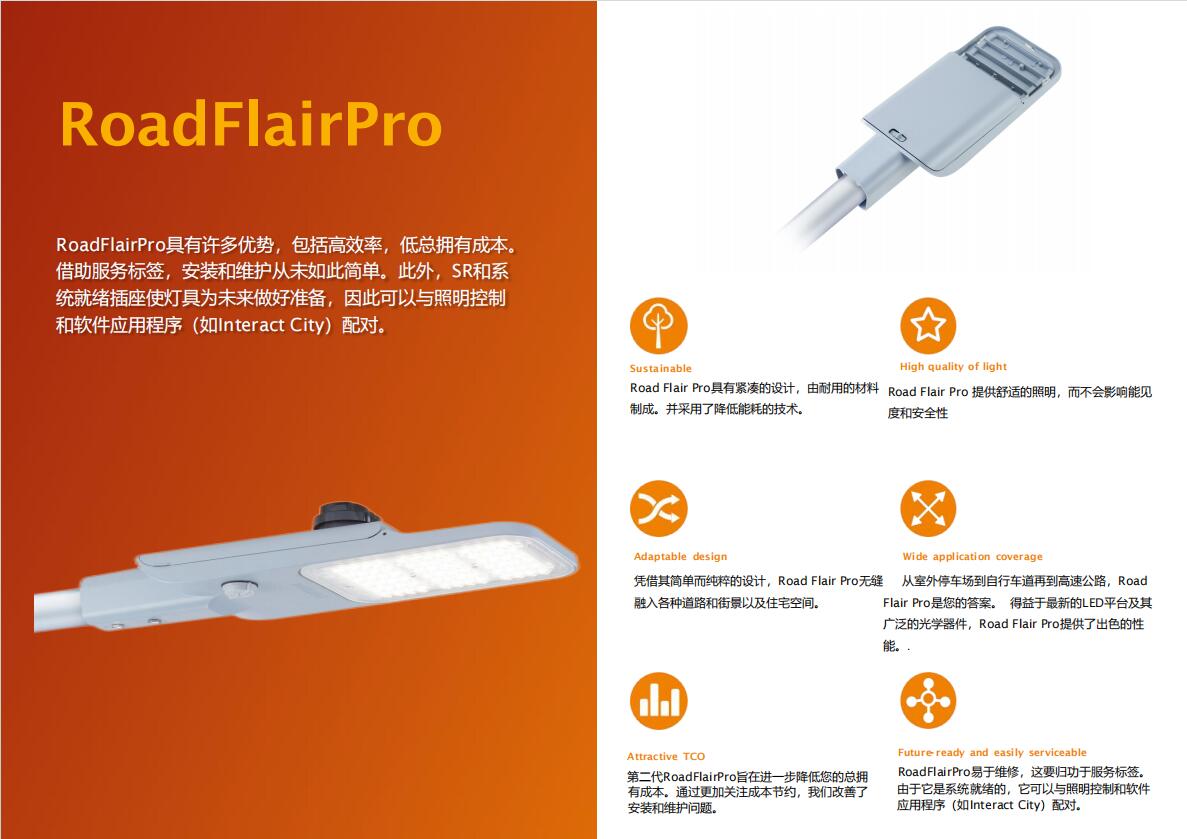 Road Flair Pro具有緊湊的設計,由耐用的材料制成。并采用了降低能耗的技術。提供舒適的照明,而不會影響能見度和安全性
