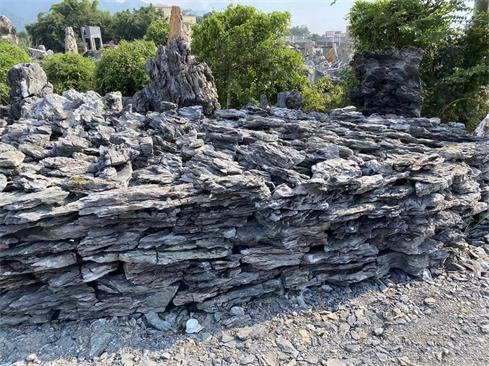 英石疊石園林假山景觀美化觀賞造景設計。片石多致,它堆疊的假山仿若石花盛開一般,層層疊疊、似花非花。廣東的假山石—英石薄片疊石。小英石原石假山設計,花園別墅小英石裝飾,清遠英德的小英石假山設計,真的是好看,應該很多人都有同感,都是經過人工一塊一塊堆砌上去的,慢工出細活。酸洗過后的小英石是黑色的,紋路清晰,酸洗后的小英石比較美觀。