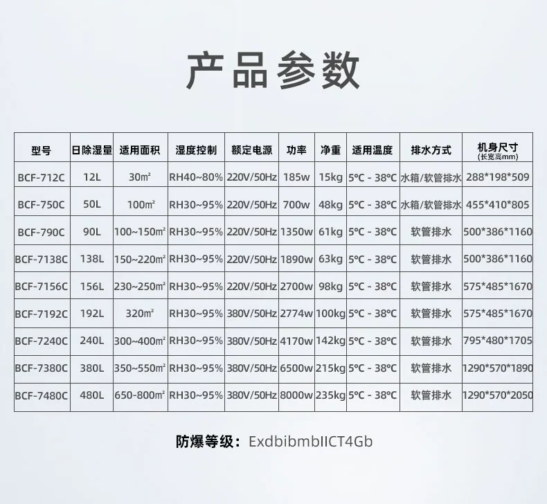 我公司出品的防爆除濕系列機(jī)型通過(guò)防爆技術(shù)加工處理,廣泛應(yīng)用于國(guó)防、科研、石油、化工、加工制造、生物等存在ⅡA、ⅡB、IIC級(jí),T1~T4組可燃性氣體、蒸汽與空氣混合形成的易引發(fā)爆炸的危險(xiǎn)場(chǎng)所,是針對(duì)有防潮除濕要求場(chǎng)所設(shè)計(jì)的除濕調(diào)溫設(shè)備,具有降濕、低熱、通風(fēng)等多種功能。系列產(chǎn)品均通過(guò)防爆電氣產(chǎn)品質(zhì)量監(jiān)督檢測(cè)中心檢驗(yàn),獲得防爆電氣設(shè)備防爆合格證;其外形美觀,設(shè)計(jì)合理并具有安裝維修方便等,全系列防爆產(chǎn)品內(nèi)部采用壓縮機(jī)、微電腦控制、溫濕度切換顯示,具有噪聲低、性能穩(wěn)定、操作簡(jiǎn)便等優(yōu)點(diǎn)。深受廣大行業(yè)客戶喜愛(ài),并以部分錄入行業(yè)定點(diǎn)采購(gòu)。