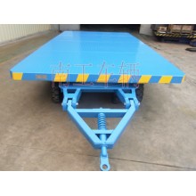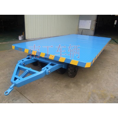 8噸無動力叉車牽引平板拖車 藍色,佛山南工車輛長期非標訂制,牽引平板拖車無動力,主要用于碼頭、工廠、港口等場區內運輸。
