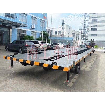 22噸預制方艙平板拖車 重型工業平板拖車南工車輛長期非標訂制,平板拖車用于工業、倉庫、物流中心、碼頭等場區內貨物短途運輸,也可配置方艙,房車,移動商店等房屋機構牽引移動,短途周轉運輸。