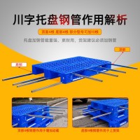 川字網(wǎng)格托盤共有8個(gè)鋼管槽,面4腿4。面部鋼管作用于增加動(dòng)載腿部鋼管作用于上貨架。