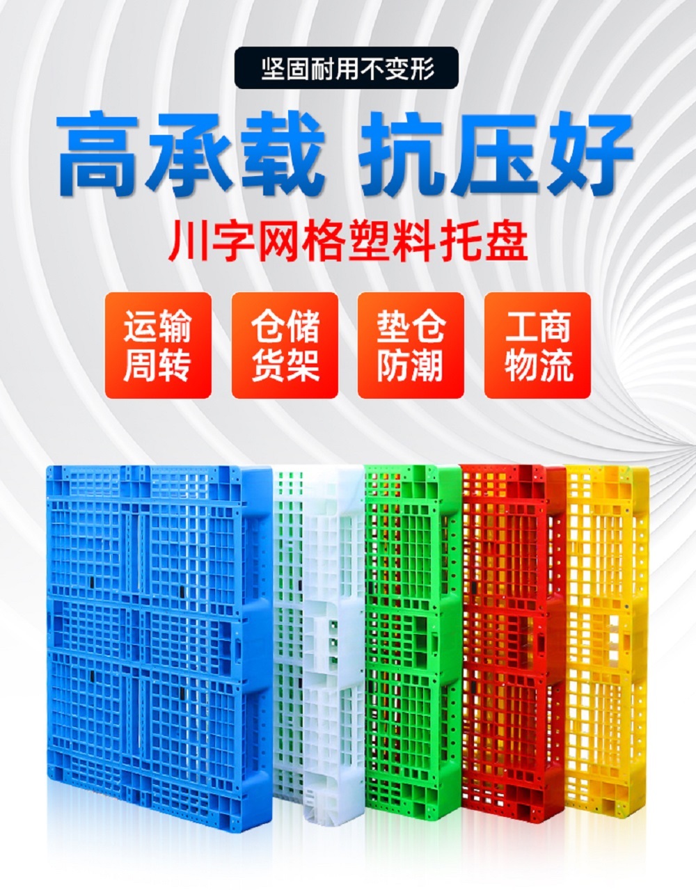 我們有網(wǎng)格川字、平板川字、網(wǎng)格田字、網(wǎng)格雙面、焊接、網(wǎng)格九腳、平板九腳等多種規(guī)格型號(hào)的托盤任您選擇,支持印制LOGO、定做顏色等。