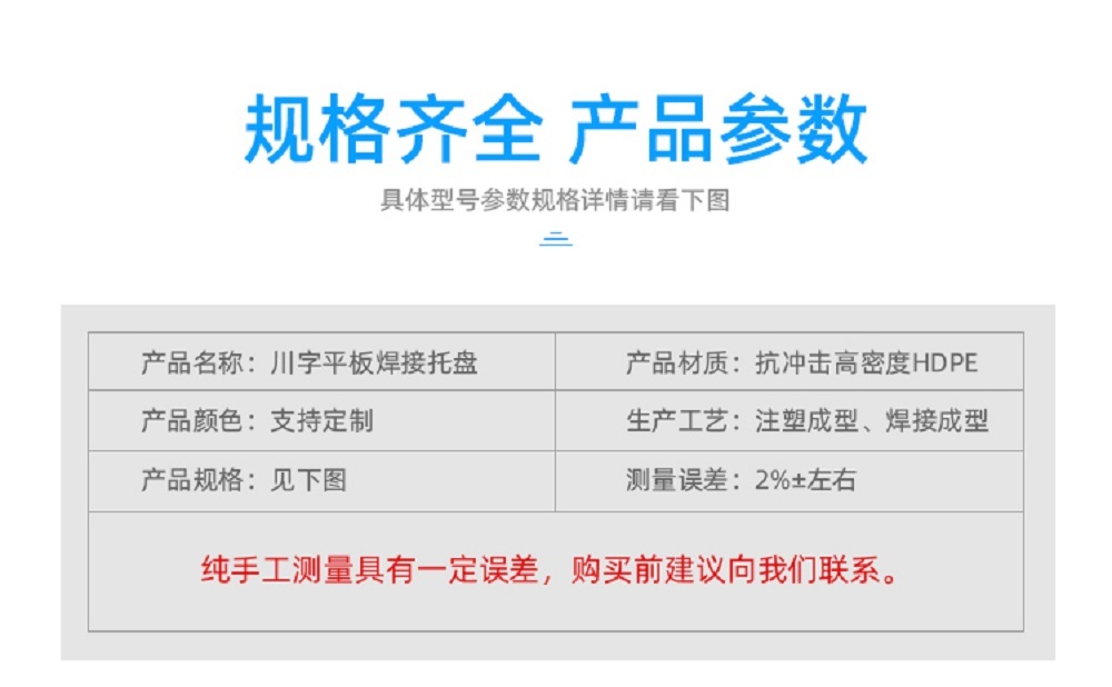 我們有網格川字、平板川字、網格田字、網格雙面、焊接、網格九腳、平板九腳等多種規格型號的托盤任您選擇,支持印制LOGO、定做顏色等。