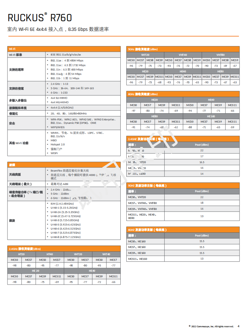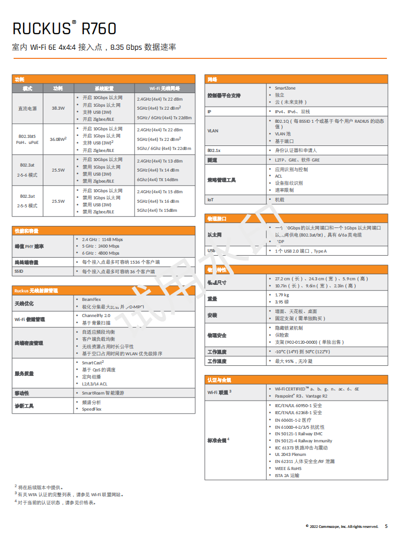 R760是 RUCKUS *高容量的三頻三并發(fā) Wi-Fi 6E 接入點(AP) ,支持12個空間流(6GHz 的4x4:4,5GHz 的4x4:4,2.4 GHz 的4x4:4)。