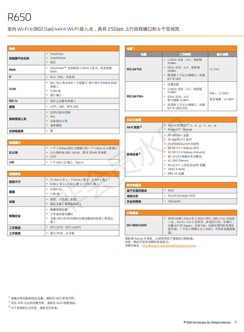 室內無線接入點901-R650-WW00RUCKUS R650  Wi-Fi 6 室內AP,支持2.4GHz和5GHz雙頻,4X4:4(5GHz)2X2:2(2.4GHz), OFDMA,MU-MIMO。1個2.5以太網端口,1x10/100/1000Mbps以太網口,支持802.3at POE供電輸入,內置BLE和ZigBee模塊,1個USB2.0接口,電源適配器和POE模塊需要另外采購。最多支持512個終端并發。
