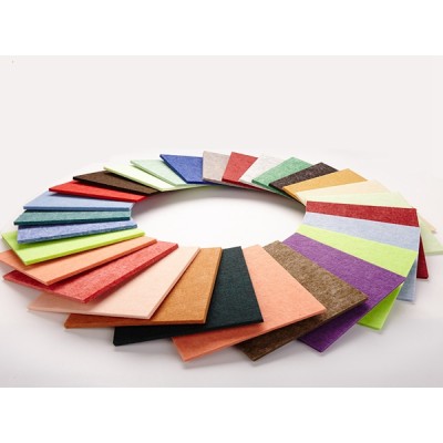 百分之百聚酯纖維,至少 75% 的消費后回收材料(PET 瓶片); 聚酯纖維吸音板完全安全、無毒、無過敏、無刺激性。經高技術熱壓并以繭棉形狀制成,實現密度多樣性確保通風,成為吸音及隔熱材料中的優秀產品,在125~4000HZ噪聲范圍內高達吸音系數達到0.9以上,根據不同需要縮短調節混響時間,清除聲音雜質,提高音響效果,改善語言的清晰度。產品具有裝飾、保溫、阻燃、環保、輕體、易加工、穩定、抗沖擊、維護簡便等特點。成為室內裝修的裝飾吸音材料。
