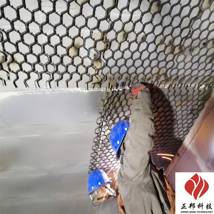 1、在設備表面上焊接龜甲網,龜甲網采用電弧焊焊接,每個接觸骨架空格內雙面焊接,焊點間距約25毫米。其焊點抗拉強度平均值:380Mpa抗壓強度平均值:560Mpa。