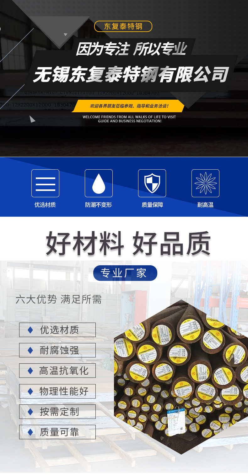 公司簡介   無錫東復(fù)泰特鋼有限公司地處華東地區(qū)很大的鋼鐵貿(mào)易集散地 — 無錫,是一家大型鋼材加工、銷售和配送的企業(yè), 主要以CrMo(鉻鉬系列)、CrNiMo(鉻鎳鉬系列)、CrMnMo(鉻錳鉬系列)、碳素鋼( A105、10#、20#、25#、35#、Q345B)軸承鋼(GCr15,GCR15SiMn);易切削鋼(1215,12L14,1144);彈簧鋼(65Mn,60Si2MnA,50CrVA)螺栓鋼 (25Cr2MoV、25Cr2Mo1V、B16、20Cr1MO1VTiB 、20Cr1Mo1VNbTiB、2Cr12NiMO1W1V 、38CrSi)耐熱鋼(15CrMo ,12Cr1MoV, 1Cr6Si2Mo) (熱作模具鋼,冷作模具鋼,塑料模具等等)銷售東北特鋼、大冶特鋼、興澄特鋼、撫順特鋼、西寧特鋼、巨能特鋼、淮鋼、...