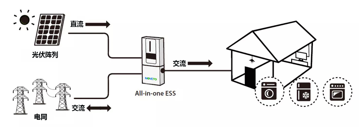 MoveTo All in One ESS電池(光伏儲能發電一體機)將 逆變器 與 48V鋰離子電池組相結合,減少了儲能電池與逆變器配對的中間過程,使用起來更快更方便。