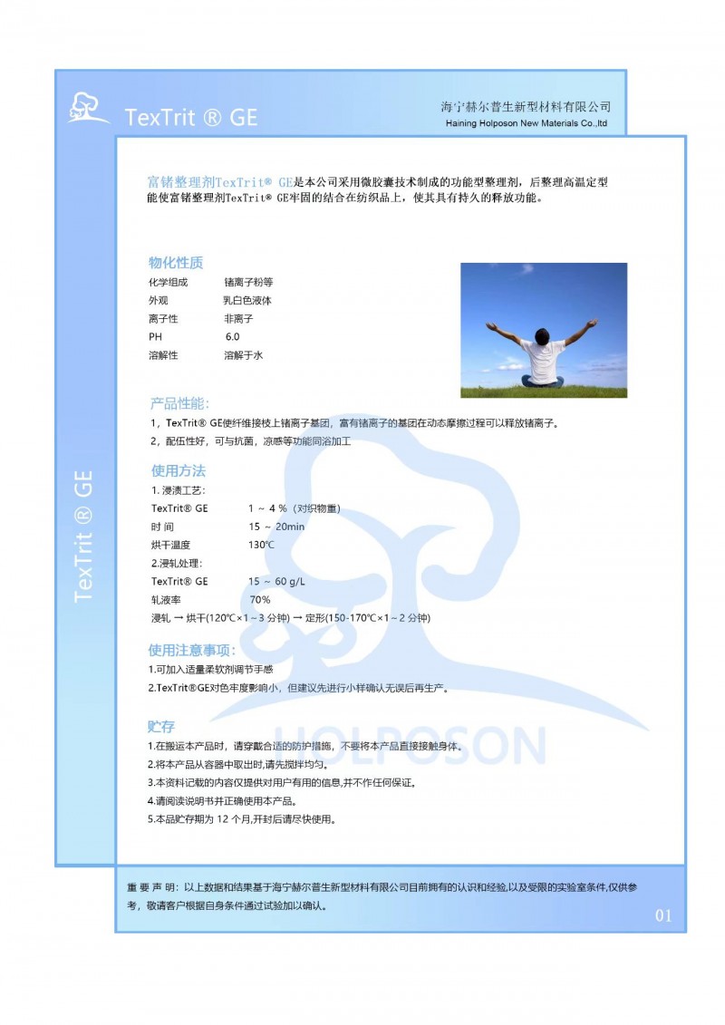 富鍺整理劑HOLPOSON? GE是本公司采用微膠囊技術制成的功能型整理劑,后整理高溫定型能使富鍺整理劑HOLPOSON? GE牢固的結合在紡織品上,使其具有持久的釋放功能。