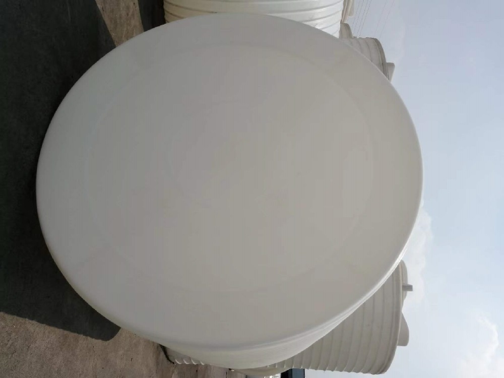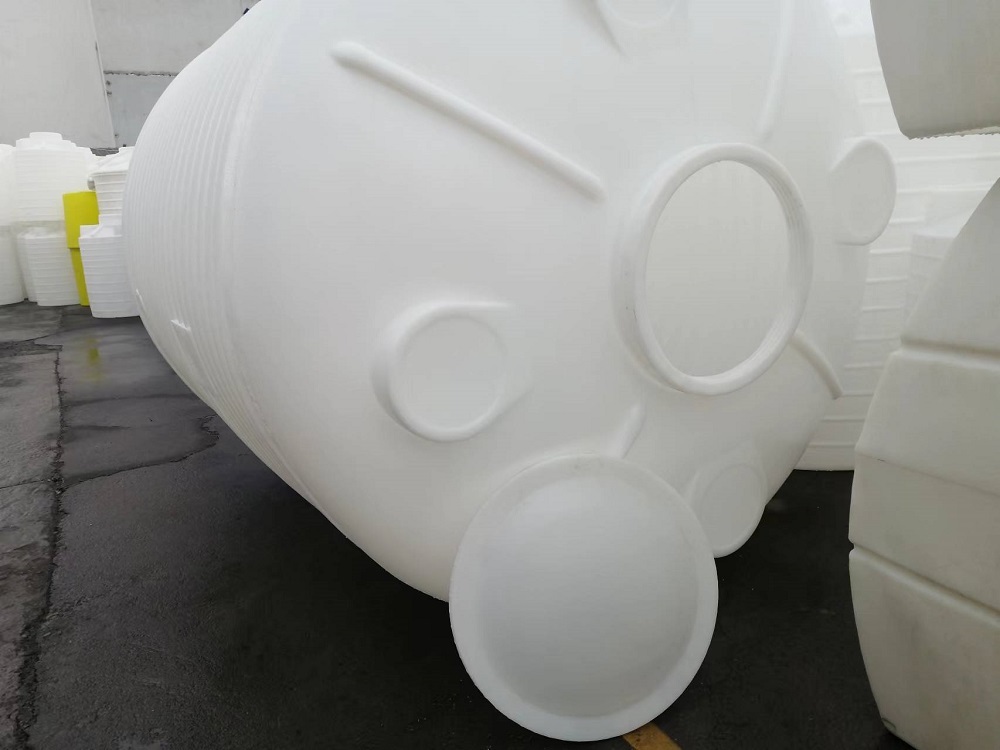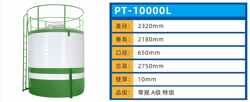 PT10000L塑料儲罐,容積10000L。采用性低密度聚乙烯LLDPE為原料,滾塑一次成型。儲罐采用立式平底圓柱形設計,占地面積小。罐身設有360°梯形環繞加強筋,提升整體抗壓性,不易變形。儲罐頂部大口徑設計,配有蓋子。并設有四個開口平臺,可根據客戶需求開孔。罐底加厚加固設計,承載能力更強。