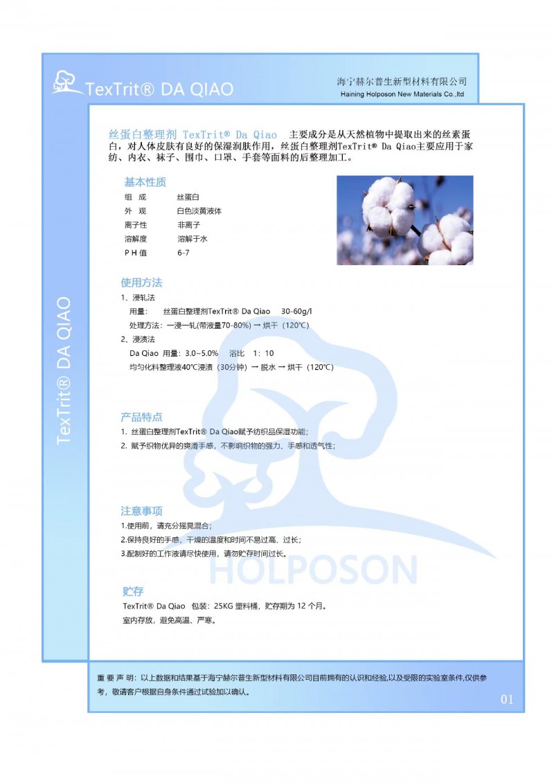 1. 絲蛋白整理劑HOLPOSON? Da Qiao賦予紡織品保濕功能;