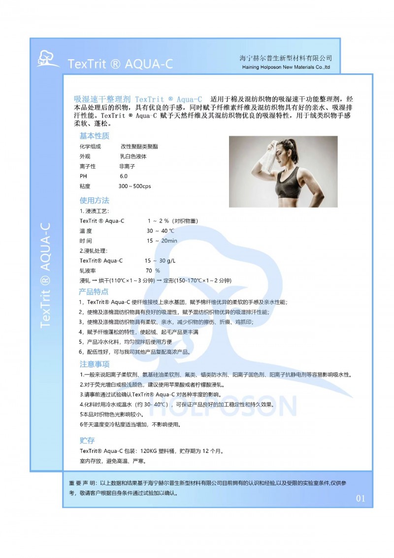 HOLPOSON? Aqua-C 適用于棉及混紡織物的吸濕速干功能整理劑,經本品處理后的織物,具有優良的手感,同時賦予纖維素纖維及混紡織物具有好的親水、吸濕排汗性能。HOLPOSON? Aqua-C賦予天然纖維及其混紡織物優良的吸濕特性,用于絨類織物手感柔軟、蓬松。