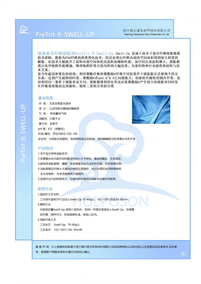 Swell-Up是屬于高分子復合纖維溶脹裂離技術范疇,既稱為PA6纖維的高密度化技術,經過處理后纖維內部的空間體積得到很大程度的膨脹,此技術大幅提升了面料內部空間體積及面料的獨特性能,如空間比表面積增大,溶脹裂離后化學吸附性能增強,物理吸附性等方面均得到大幅改善。為某些特種行業提供原材料與技術方案。