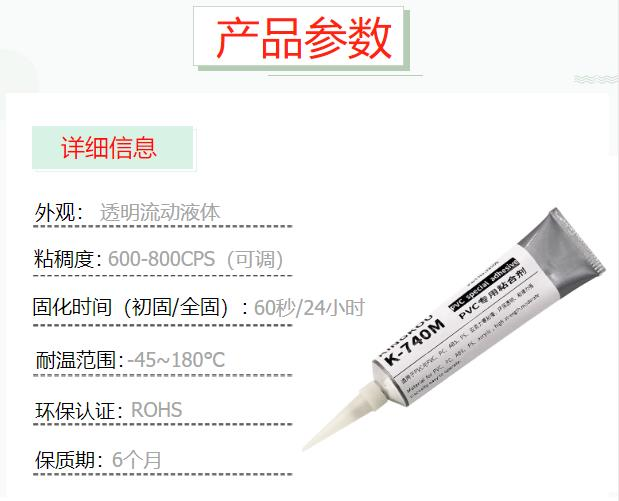 K-740M中粘度適合于PVC塑料件的接榫及大面積PVC塑料的粘接,流動性適中,透明度較好。