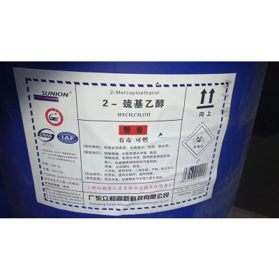 2-巰基乙醇是一種具有特殊臭味的無色透明液體,有毒,可燃,易溶于水、醇和醚等多種有機溶劑。沸點157℃,閃點73.9℃。