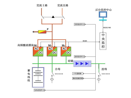 兩路市電經過交流切換輸入,給高頻整流模塊供電;高頻整流模塊將交流市電轉換為直流電,給蓄電池組充電及向合閘母線供電,同時合閘母線通過降壓裝置給控制母線供電。中央監控器分別對交直流配電單元、高頻整流模塊、電池充電管理、電池巡檢單元、絕緣檢測單元進行集中設置與管理。并可通過RS232/485后臺通訊接口聯接到后臺監控中心,實現遙測、遙信、遙調、遙控的“四遙”功能。實現無人值守功能