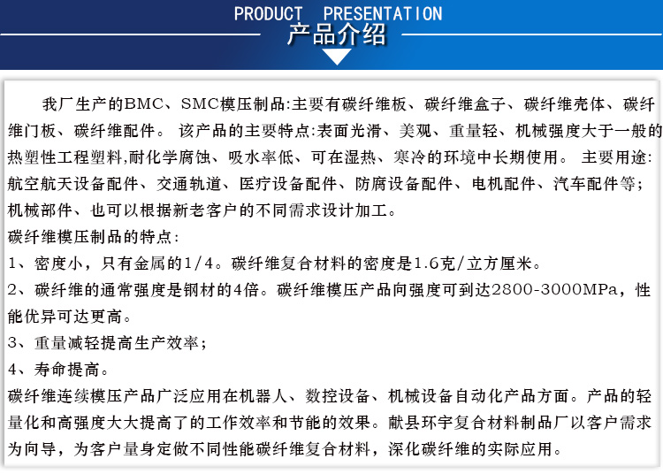 公司簡介   獻(xiàn)縣環(huán)宇復(fù)合材料制品廠(簡稱環(huán)宇高新)成立于1990年,是集研發(fā)、生產(chǎn)、銷售于一體的碳纖維復(fù)合材料、玻璃鋼制品高科技企業(yè),具有現(xiàn)代化智能擠拉生產(chǎn)線50條、德國進(jìn)口連續(xù)模壓設(shè)備5臺、纏繞設(shè)備10臺、smc\bmc模壓設(shè)備15臺、RTM生產(chǎn)設(shè)備、大型熱壓罐等碳纖維復(fù)合材料加工設(shè)備,同時配有相應(yīng)產(chǎn)品性能檢測設(shè)備,專業(yè)研發(fā)、攻關(guān)導(dǎo)師、碩士研究生多名,真正做到了產(chǎn)、學(xué)、研、銷售一體化發(fā)展,生產(chǎn)技術(shù)人員50余名,主要從事碳纖維型材、輕量化碳纖維部件(CFRP)、玻璃纖維型材(FRP),擁有完整、科學(xué)的質(zhì)量管理體系,自有產(chǎn)品數(shù)字化測試、分析實驗室,具備精準(zhǔn)科學(xué)產(chǎn)品自我測試分析能...